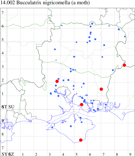 Local on embankments, waste ground and rough grassland throughout the British Isles. In Hampshire mainly confined to the coast, east of Southampton, very uncommon elsewhere. Recorded on the Isle of Wight for the first time at Freshwater in 2010. Wingspan 7-8 mm. Flies in the late afternoon and early morning. Distinguished from other Bucculatrix by dark metallic bronze ground colour, with diffused whitish spots on dorsum at one-half and three-quarters and two similar spots on costa slightly beyond, and white eye-caps (MBGBI Vol 2). Larva mines leaves of Ox-eye Daisy.