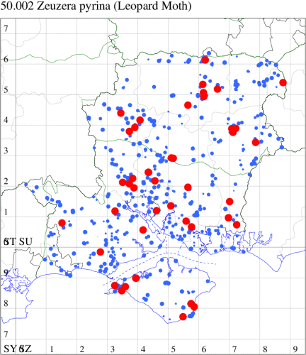 For the maps, all records prior to 2024 are shown by a blue dot (the larger the dot, the more recent), with the current year's records shown in red. As previous records are superimposed on any report for 2024, new sites have greater emphasis (i.e. will show as 'more red').