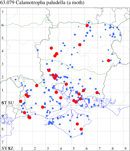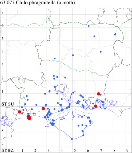 Local in reed-beds and fens throughout much of England and Wales. In Hampshire and on the Isle of Wight common in extensive reed-beds, mostly on the coast, and an occasional wanderer elsewhere, with only a few records from northern Hampshire, at Leckford, Fleet Pond and Old Basing. Wingspan male 24-32 mm, female 30-40 mm. Males are unmistakable; females could be confused with female Schoenobiinae, but in those species the costa is convex towards apex, whereas in C. phragmitella it is distinctly concave [Goater]. Larva feeds within stems of Common Reed and Reed Sweet-grass.