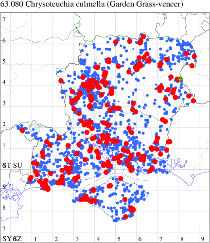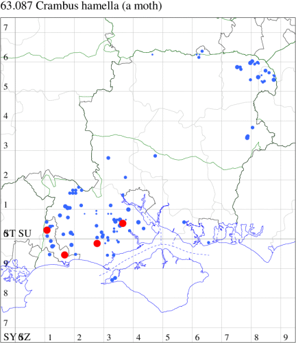 Rare immigrant to southern England from mainland Europe. In Hampshire and on the Isle of Wight there are recent records from Southsea in 2001, Ventnor and Sandy Point in 2006, and two on the Island in 2009. Wingspan 17-18 mm. The scruffiest in appearance of British Crambids, and easily overlooked as a small, dusky C. falsella, or ignored altogether [Goater]. Voucher specimen should be retained for confirmation of identification. Larva feeds on mosses growing on Apple, Plum and Poplar, but there is no evidence of breeding in the UK.