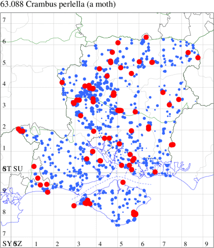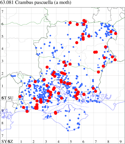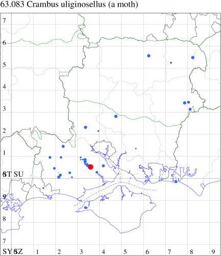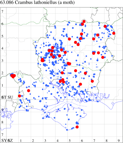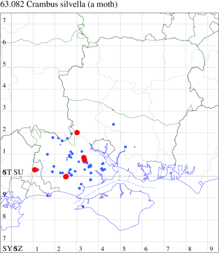 Nationally scarce (Nb) in bogs in parts of England and Wales. In Hampshire locally common in the wetter bogs of the New Forest, elsewhere appears to be resident in the Bordon area (vice-county 12). Very rare in the Isle of Wight, most recently in 2010. Wingspan 18-23 mm. Looks whiter than other Crambus in flight, and distinguished by broad white median longitudinal streak which touches costa to half-way [Goater]. Larva feeds on various grasses, living within a silken tube or tent.