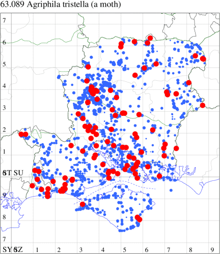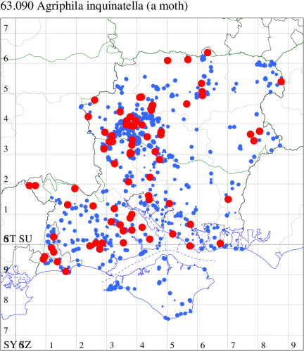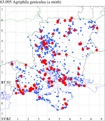 For the maps, all records prior to 2024 are shown by a blue dot (the larger the dot, the more recent), with the current year's records shown in red. As previous records are superimposed on any report for 2024, new sites have greater emphasis (i.e. will show as 'more red').
