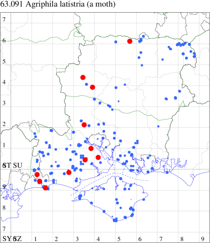 VC11: Brockwood, four, 10 Aug (SDut); Blashford Lakes HIWWT NR, one, 10 Aug (PWhtk); Hale Purlieu, NF, present, 28 Jul (JPuz); Brockenhurst, one, 04 Aug (MWelf); Lyndhurst, NF, two, 07 Aug (AShe); Pig Bush, NF, two, 24 Jul (NRJ); Marchwood, one, 30 Jul (TDCh); one, 29 Jul (CTha); Woodlands, NF, one, 09 Jul (RBW); Mottisfont, two, 25 Jul; one, 26 Jul (TSto); Timsbury, one, to lighted window, 06 Sep (RIB,DIB); Romsey, one, 20 Jul (NRJ); Ashley, one, 07 Aug (GCE); Brownwich Cliffs, Titchfield, one, det gen female, 26 Jul; one, 06 Sep (F.M.G.); Funtley, one, 02 Aug (TDC); Botley, one, 23 Jul; one, 01 Aug; one, 05 Sep; one, 28 Jul; one, 30 Jul (SLB); Portchester, one, 10 Jul; one, 19 Jul (CEH, JGS); one, 28 Jul; one, 03 Aug (DH-J); Portsmouth, one, 14 Jul; one, 16 Jul; two, 17 Jul; two, 18 Jul; one, 19 Jul; four, 27 Jul; two, 28 Jul; one, 29 Jul; two, 30 Jul; two, 01 Aug; two, 10 Aug; one, 11 Aug (IRT); Merritown Heath, present, 17 Aug (DFoo); Hurn, one, 24 Jul; one, 12 Aug (MJef); Christchurch: Cross Way, one, 29 Jul (LPyk); Hengistbury Head, one, 17 Jul (MJef); Hengistbury Head NNR, one, 01 Aug (HengistH det. RPH); one, 11 Aug (MoTay det. MJef); one, 18 Aug (HengistH det. MJef); Hengistbury Head, two, 30 Jul; one, 27 Aug (MJef); New Milton, one, 23 Jul (RPH); Sway, one, 17 Jul; one, 19 Jul; one, 26 Jul; one, 28 Jul; one, 02 Aug; one, 10 Aug; one, 11 Aug; one, 30 Sep (SKee); Browndown, 11, 09 Aug (F.M.G.);