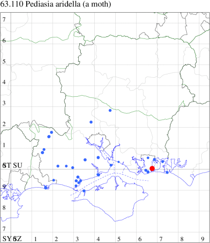 Nationally scarce (Nb) on dry grassland and golf courses from Hampshire to Essex. In Hampshire, absent from much of the centre of the county, but relatively common in the north-east and south, where a notable site is Sandy Point on Hayling Island. On the Isle of Wight very intermittently recorded, with just one record every ten years on average. Wingspan 20-30 mm. The main confusion species, P. aridella, and P. contaminella both share characteristic resting posture with head down and abdomen pointing obliquely upwards, but P. aridella is more obviously streaked longitudinally. Larva feeds on stems and leaves of grasses such as Sheep's-fescue, living within a silken tube.