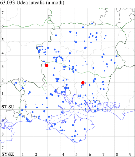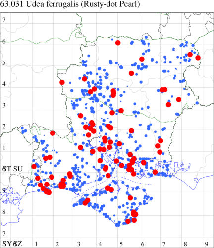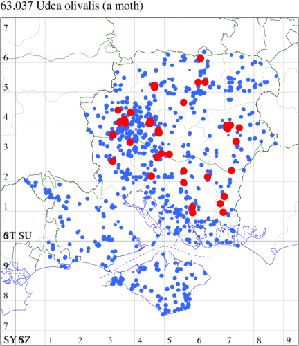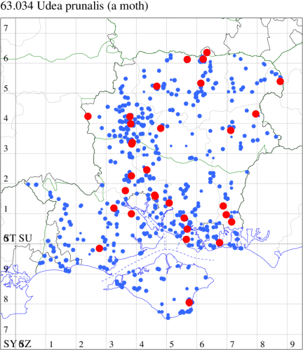 Common in thickets, copses and hedgerows throughout the British Isles. Frequently recorded and well distributed across much of Hampshire and the Isle of Wight. Wingspan 23-26 mm. Slate-coloured overall appearance and weak markings distinguish from other Udea species, lack of white patch between the stigmata distinguish from U. olivalis. Larva feeds on various herbaceous and woody plants