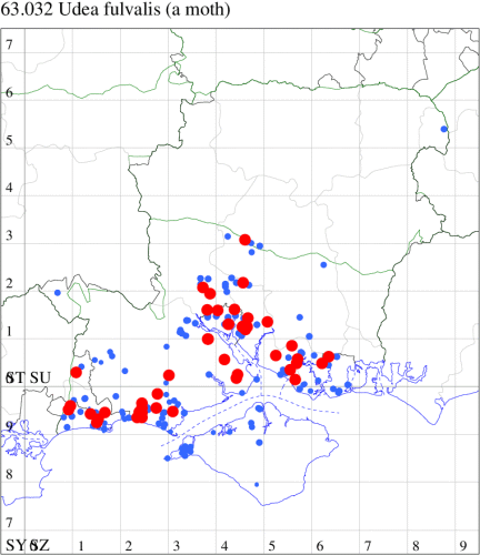Formerly considered a migrant to southern England from mainland Europe, in some years arriving in sufficient numbers to breed, it now has become established since the mid 1990s predominantly along the south coast of Hampshire inland into the New Forest, and along the north shore of the Isle of Wight; it is spreading northwards and has now reached the VC11/VC12 boundary, and one in the north-east in 2022 represents the first incursion from the Sussex heaths to the east. Wingspan 24-29 mm. Similar in structure, size and markings to U. prunalis, but differs in the dull fulvous brown coloration of the forewing, which is slaty grey in U. prunalis, and in the wider submedian sinus of second line [Goater]. Larva feeds on Black Horehound, Meadow Clary, Red Campion and White Campion.