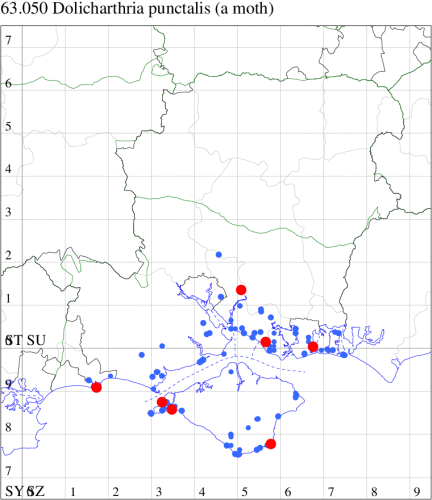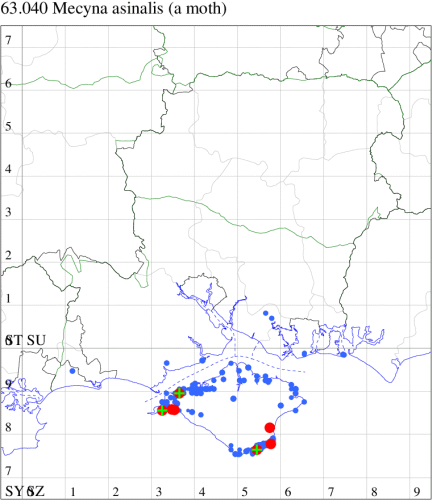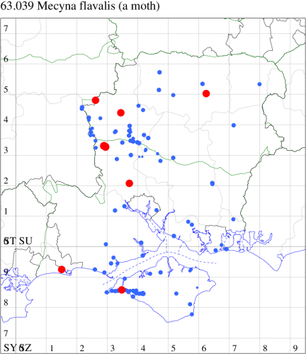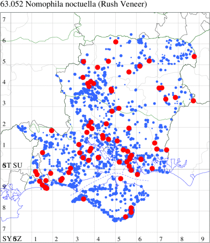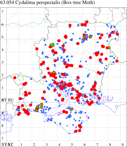 For the maps, all records prior to 2024 are shown by a blue dot (the larger the dot, the more recent), with the current year's records shown in red. As previous records are superimposed on any report for 2024, new sites have greater emphasis (i.e. will show as 'more red').