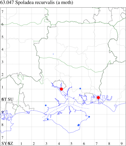 Rare immigrant to southern England from southern Europe. Formerly an accidental import in vegetables from tropical Africa, increasingly seen as an immigrant from mainland Europe. First recorded in Britain in Surrey and Dorset in September 1951, with 19 up to the end of 2005 but 2006, an exceptional year for migrants, saw 18 alone. In Hampshire recorded for the first time in October 2011, when individuals turned up on Hayling Island and in Southampton, and the third record for our area was in Bonchurch, Isle of Wight, in 2013. North Hampshire's first record was in Leckford on 31 Oct 2014, and a further Isle of Wight individual was recorded in Totland on 18 Dec 2015, part of that year's extraordinary late December migrant influx. Wingspan 22-24 mm. Similar to Diasemia reticularis and Diasemiopsis ramburialis, which both have chequered fringes. Larva feeds on fruits and vegetables, causing sufficient damage to be a serious pest on spinach, beet, cotton, maize and soya in some areas; no evidence of breeding in the UK.
