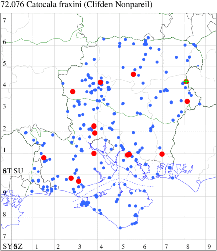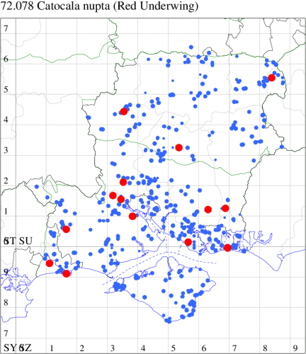A once rare but now increasing species, associated with ancient oak woodland in parts of southern England, a priority species under the UK Biodiversity Action Plan. At the turn of the century it was very much confined to the New Forest and two large woodlands in south Wiltshire, with occasional records from elsewhere in southern England, which may have resulted from internal dispersal or migration from the continent. In Hampshire and on the Isle of Wight the 21st century has seen increasing scattered records throughout the county, still centred on the New Forest but now appearing well away from the historical locus here, likely to be a result of increased immigration from across the Channel and localised breeding in new locations. Wingspan 50-66 mm. The most likely confusion species are Red Underwing C. nupta and Dark Crimson Underwing C. sponsa, and best distinguished from this by the shallow ‘W’ shape of the black postmedian cross-band of the hindwing. C. sponsa is larger (a subjective characteristic unless both seen together), and generally has a darker, more uniformly coloured forewing, with fewer patches of white scales near reniform stigma. Larva feeds on Pedunculate Oak and Sessile Oak, over-wintering as an egg.