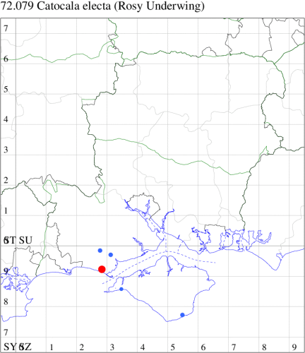A species that was a rare immigrant, temporarily established in Kent and the Norfolk Broads in the past, but which since c. 2005 now appears be making a comeback as a resident species in places. In Hampshire and on the Isle of Wight historically a rare immigrant with up to 1995 about twenty records altogether. Since 2006, the species has started to be recorded more regularly, for example, at Ventnor and Totland on the Island, and at Brockenhurst in the New Forest, and sightings have increased year on year. It is almost certainly resident in a number of localities across southern England (including our area) and while there is the possibility that some of these individuals may have originally originated from deliberate release of captive stock, it is most likely that most populations originate from migrants remaining to breed in this country. Wingspan male 84-100 mm, female 98-112 mm. The original name for this species, Blue Underwing, sums up the identification criteria nicely! Larva feeds on Aspen, no evidence of breeding in the UK.