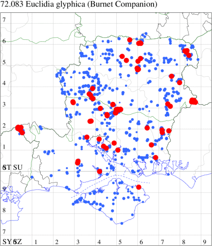 For the maps, all records prior to 2024 are shown by a blue dot (the larger the dot, the more recent), with the current year's records shown in red. As previous records are superimposed on any report for 2024, new sites have greater emphasis (i.e. will show as 'more red').