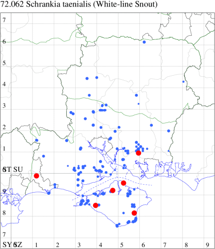 Local in damp woodland, fens, damp meadows and boggy heathland throughout England and Wales, and also in the Scottish Highlands. Widespread and locally common in Hampshire and on the Isle of Wight. Wingspan 19-22 mm. Small size suggests a species of micromoth, but most resembles White-line Snout S. taenialis. Larva feeds on Heather, Wild Marjoram and Wild Thyme.