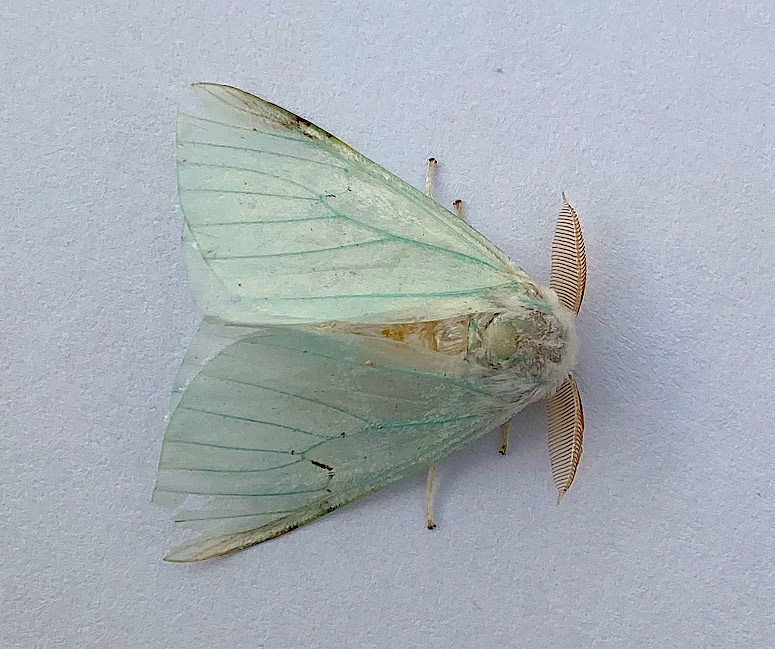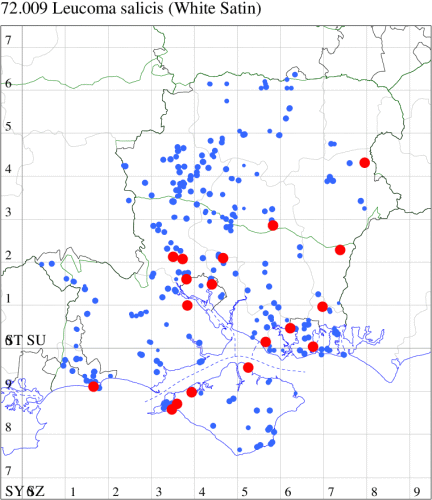 Local in plantations, hedgerows, scrub, parks and gardens throughout England. Widespread and locally common in Hampshire, but recorded so far from the Isle of Wight only once this century. Wingspan 43-60 mm. Separated from other large, plain white moths by white abdomen, black and white ringed legs, and silky sheen. Larva feeds on Aspen, Poplar, Sallow and Willow.