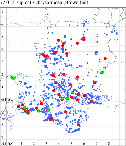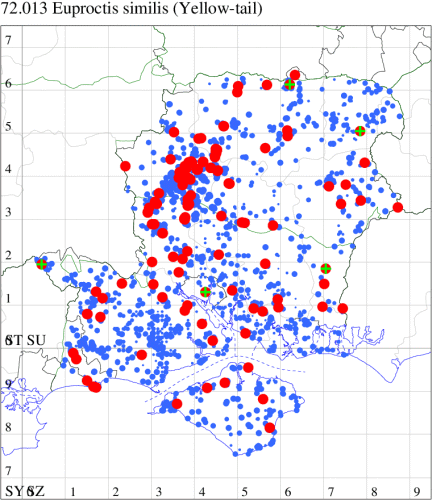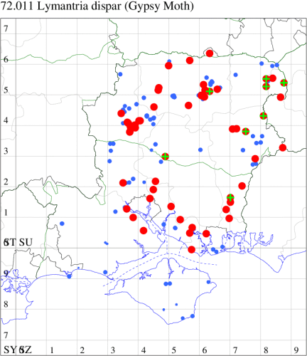 For the maps, all records prior to 2024 are shown by a blue dot (the larger the dot, the more recent), with the current year's records shown in red. As previous records are superimposed on any report for 2024, new sites have greater emphasis (i.e. will show as 'more red').