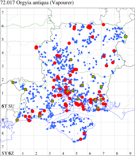 Common in urban gardens and parks, open woodland, fens, hedgerows, heathland and moorland throughout the British Isles. Widespread and common in Hampshire and on the Isle of Wight. Wingspan male 35-38 mm, female wingless. Male day-flying, occasionally coming to light. The main confusion species is Scarce Vapourer O. recens, which differs in having a white subapical spot. Larva feeds on various broad-leaved trees and shrubs, including Birch, Hazel, Sallow, Hawthorn, Blackthorn, Elm, Lime and Oak, over-wintering as an egg.