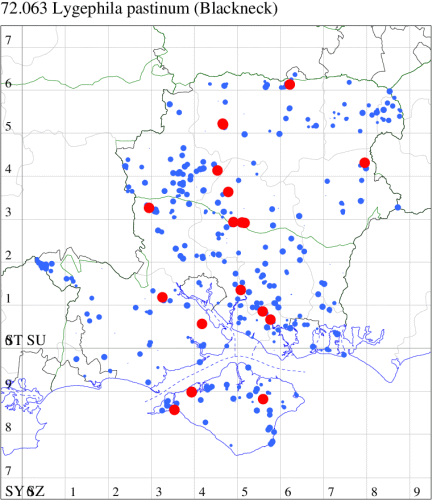 VC11: Ashley Heath, NF, two, field obs., 05 Aug (MLeC); Linford Bottom, two, 05 Aug (CLew); Burley, NF, one, field obs., 22 May (AMD); Broughton Down, two, field obs., 18 May; Pig Bush, NF, one, 24 Jul (NRJ); Portsdown, two, field obs., 20 Jul (DPH); Sway, one, 02 Aug (SKee)
