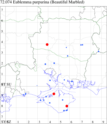 An increasingly common migrant from southern Europe, appearing in southern England for the first time in Dorset in 2001, but only identified from a set specimen during 2004, a year which saw an influx of some eight moths of this previously unrecorded species. In Hampshire the first was trapped at Cheriton Wood, vice-county 12, on 31 July 2004, and the second at Southsea, vice-county 11, on 16 August 2004 - these were the second and third British records. Subsequently recorded at Waterlooville on 6 August 2005 and at Beaulieu on 30 July 2006, both in vice-county 11. The Isle of Wight had to wait until 2018 for its first record, and since that year it has been recorded annually, sometimes multiple times, in both counties. Wingspan 26-30 mm. Some poorly marked specimens resemble f. carthami of Purple Marbled E. ostrina, however the postmedian fascia which bisects the purple distal half of the wing in Beautiful Marbled is absent in Purple Marbled. Larva feeds on Creeping Thistle, no evidence of breeding in the UK.