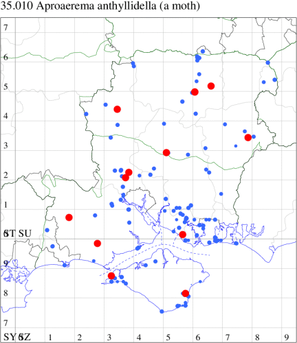 Local on rough ground in England, south of a line from Shropshire to the Wash, becoming less common northwards; rarely in Wales, Scotland and Ireland. In Hampshire recorded in both vice-counties, sometimes commonly; on the Isle of Wight, although it almost certainly still occurs there, no recent record has been received. Wingspan 11-14 mm. The most likely confusion species are S. larseniella and S. cinctella, neither of which has a fascia on the underside of the forewing nor a costal spot on the underside of the hindwing (MBGBI Vol 4 part 2). Larva feeds on Bird's-foot Trefoil, Clover, Black Medick and Spotted Medick, living between leaves spun together with silk.