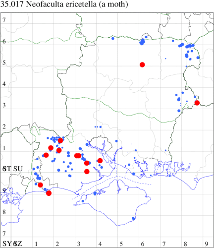 Common on heathland and moorland, also in gardens where heather is grown, throughout much of the British Isles. In Hampshire common on heathy ground, especially in the New Forest and on the heaths in the north-east of the county. On the Isle of Wight, only recorded in recent years from Headon Warren and Cranmore. Wingspan 15-18 mm. Larva feeds on flowers of Heather, Bell Heather and Cross-leaved Heath, subsequently living within a silken web.
