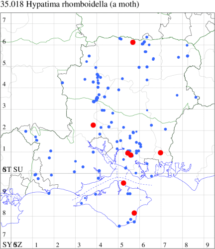 VC11: Rockford Common, present, field obs., 08 May (LTho); Ogden's Purlieu, NF, one, gen. det, 11 Jul; Ocknell Plain, NF, present, field obs., 09 Jun; Howen Bottom, NF, one, 22 Jul; Parc Pale, NF, present, at dusk, 28 Jun (AMD); Beaulieu Heath, NF, one, field obs., 08 Jun (WLan); Pig Bush, NF, 11, field obs., 13 Jun (NRJ); Beaulieu Heath, NF, one, field obs., 28 Jun (AMD); Dibden Purlieu, one, 25 May (RAC); Christchurch: Cross Way, one, 29 Jul (LPyk); Hengistbury Head, 28, 26 Jun; 13, 26 Jun; 17, 26 Jun; 43, 26 Jun (MJef);