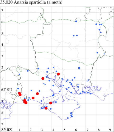 Local on heathland, downland and waste ground throughout much of the British Isles. In Hampshire locally common in the south of the county, with the few records in the north-east at Yately, Bramshott and Ludshott Commons and in the Deadwater Valley. On the Isle of Wight, the only record since 1975, when found on Tennyson Down, is from Cranmore in 2004. Wingspan 12-15 mm. The female has long, exposed labial palps, which protrude conspicuously from the labial scale tufts. Larva feeds on shoots of Gorse, Broom and Dyer's Greenweed, living within a spinning.