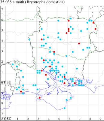 Common near buildings and around dry-stone walls throughout England, Wales and southern Ireland. Widespread and common in Hampshire. Recorded on the Isle of Wight for the first time since 1893 at Freshwater in 2009. Wingspan 11-14 mm. A light coloured species with slender forewing, contrasting markings and with the first discal above the second plical stigma, extremely pale forms of B. dryadella are distinguished from B. domestica by the much darker hindwing (MBGBI Vol 4 part 2). Larva feeds on various mosses, often on walls, living within a silken gallery.