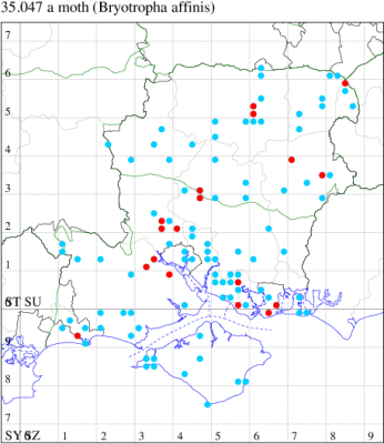 Common around old buildings and in urban areas throughout southern Britain, very local elsewhere. In Hampshire widely distributed, but not particularly common. Recorded on the Isle of Wight for the first time at Freshwater in 2010. Wingspan 9-12 mm. Main confusion species is B. similis, but B. affinis usually has small pale yellow patch adjacent to streak in centre of forewing. Larva feeds on various mosses, especially those growing on old walls, living within a silken gallery.