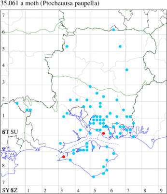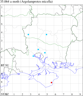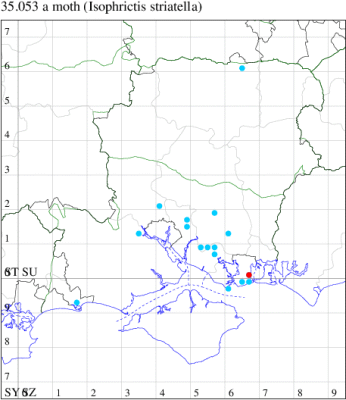 Nationally scarce (Nb) in saltmarshes on the south and east coasts of England, from Cornwall to Durham, and from Lancashire on the west coast (MBGBI Vol 4 part 2). In Hampshire still found in small numbers on the south coast from Hurst Castle in the west to Hayling Island in the east. Not recorded from the Isle of Wight since 1970. Wingspan 9-10 mm. Fairly frequent at light, and also occasionally netted during the day; a reasonably distinctive gelechiid. Larva feeds within flowers of Thrift and Common Sea-lavender, over-wintering as a pupa.