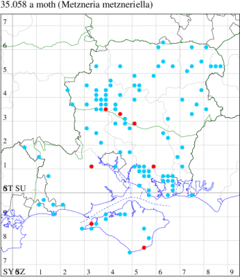 Local in waste ground, gardens, open woodland and downland throughout England and north Wales; rare in Scotland. Widespread and common in Hampshire, except for the New Forest, and in the western half of the Isle of Wight. Wingspan 16-20 mm. The main confusion species is M. metzneriella, which differs in the much darker general appearance, especially in apical and terminal areas. Larva feeds within the seedheads of Greater and Lesser Burdock, over-wintering in a cocoon.
