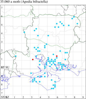 VC12: Anna Valley, Andover, one, 20 Jul; one, 14 Aug (TJN, LFom); Harestock, one, 12 Aug; one, 18 Aug; one, 23 Aug; one, 25 Aug; one, 08 Sep; one, 09 Sep (GRog); Kempshott, one, 12 Aug; one, 20 Aug (GAH); Basingstoke, one, 14 Jul; one, 11 Aug; one, 07 Sep; one, 18 Sep (MJW); one, 18 Jul; one, 14 Aug (RHil); Pamber Forest, one, netted, 11 Aug (BDal); Alton, one, to artificial light, 26 Jul; one, to artificial light, 30 Jul; one, to artificial light, 18 Aug; one, 24 Aug (DBO); Blackwater, one, 21 Jul; one, 14 Aug (BDal); Farnborough, one, 02 Jun; one, 01 Jul; one, 26 Jul (KBW)