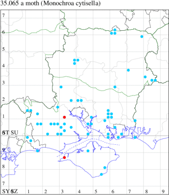 Nationally scarce (Nb) in waste ground, dry pastures and sand-dunes, south-east of a line from Somerset to Norfolk (MBGBI Vol 4 part 2). In Hampshire the main population is found in the south of the county, notably at Southsea, Funtley and Lower Test Marshes, where first confirmed for Hampshire in 1992; there is one record from the north of the county, at Bramley Frith Wood in 1999, and a few from the Isle of Wight, after the first at Cranmore in 1997. Wingspan 15-19 mm. Larva feeds within roots and lower stems of Curled Dock and Dock, over-wintering as an egg or small larva.