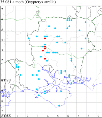 Rare (proposed as a future Red Data Book species) in a wide range of habitats, including sea cliffs, damp meadows, limestone pavements and grassland; widely but thinly distributed in scattered localities in the north and south of Britain. In Hampshire recorded for the first time at Horsea Island on 21 July 2006, where it was again seen in 2013. Not recorded from the Isle of Wight to date. Wingspan 8-13 mm. Main confusion species are E. atrella and Aproaerema anthyllidella, from which difficult to separate on external characteristics. Larva feeds within stems of Slender St John's-wort.