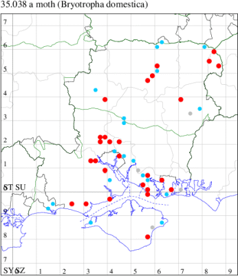 Common near buildings and around dry-stone walls throughout England, Wales and southern Ireland. Widespread and common in Hampshire. Recorded on the Isle of Wight for the first time since 1893 at Freshwater in 2009. Wingspan 11-14 mm. A light coloured species with slender forewing, contrasting markings and with the first discal above the second plical stigma, extremely pale forms of B. dryadella are distinguished from B. domestica by the much darker hindwing (MBGBI Vol 4 part 2). Larva feeds on various mosses, often on walls, living within a silken gallery.
