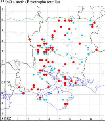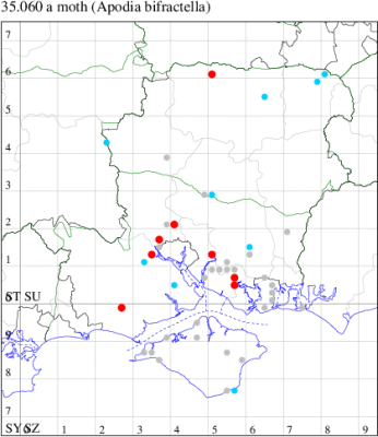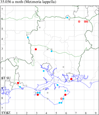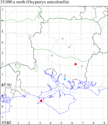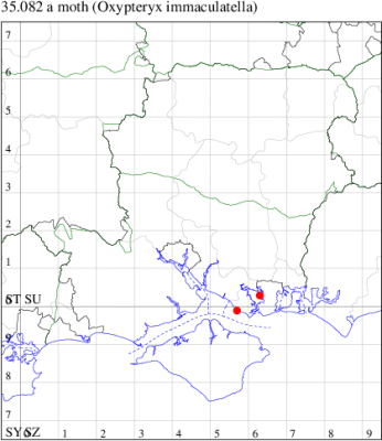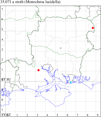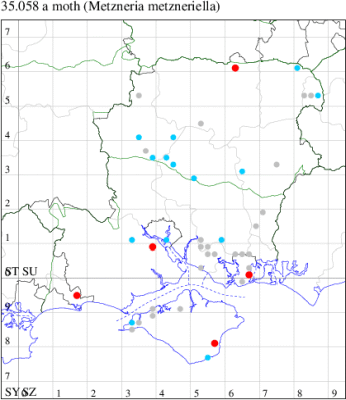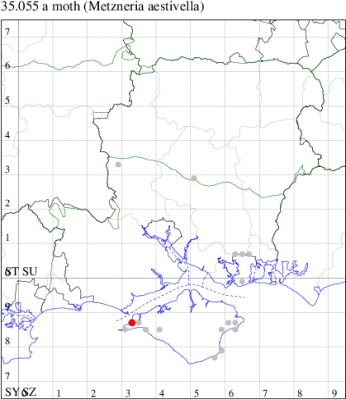 Nationally scarce (Nb) in saltmarshes on the south and east coasts of England, from Cornwall to Durham, and from Lancashire on the west coast (MBGBI Vol 4 part 2). In Hampshire still found in small numbers on the south coast from Hurst Castle in the west to Hayling Island in the east. Not recorded from the Isle of Wight since 1970. Wingspan 9-10 mm. Fairly frequent at light, and also occasionally netted during the day; a reasonably distinctive gelechiid. Larva feeds within flowers of Thrift and Common Sea-lavender, over-wintering as a pupa.