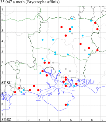 For the maps, all records prior to 2022 are shown by a blue dot (the larger the dot, the more recent), with the current year's records shown in red. As previous records are superimposed on any report for 2022, new sites have greater emphasis (i.e. will show as 'more red').