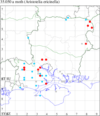 Local on heathland throughout England and Wales. In Hampshire fairly common on the heaths of the New Forest and the north-east, but very local elsewhere. Not recorded from the Isle of Wight since 1975. Wingspan 12-13 mm. Flies in afternoon, and occasionally comes to light. One of the more distinctive gelechiids, unlikely to be confused with any other species. Larva feeds on Heather, living between shoots spun together with silk, and over-wintering as an egg.