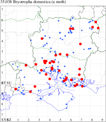 Common near buildings and around dry-stone walls throughout England, Wales and southern Ireland. Widespread and common in Hampshire. Recorded on the Isle of Wight for the first time since 1893 at Freshwater in 2009. Wingspan 11-14 mm. A light coloured species with slender forewing, contrasting markings and with the first discal above the second plical stigma, extremely pale forms of B. dryadella are distinguished from B. domestica by the much darker hindwing (MBGBI Vol 4 part 2). Larva feeds on various mosses, often on walls, living within a silken gallery.