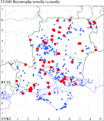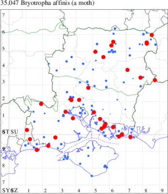 For the maps, all records prior to 2023 are shown by a blue dot (the larger the dot, the more recent), with the current year's records shown in red. As previous records are superimposed on any report for 2023, new sites have greater emphasis (i.e. will show as 'more red').