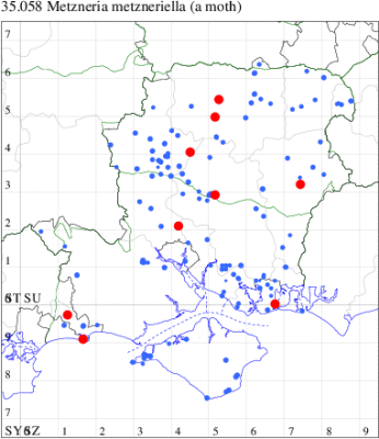 Local in waste ground, gardens, open woodland and downland throughout England and north Wales; rare in Scotland. Widespread and common in Hampshire, except for the New Forest, and in the western half of the Isle of Wight. Wingspan 16-20 mm. The main confusion species is M. metzneriella, which differs in the much darker general appearance, especially in apical and terminal areas. Larva feeds within the seedheads of Greater and Lesser Burdock, over-wintering in a cocoon.