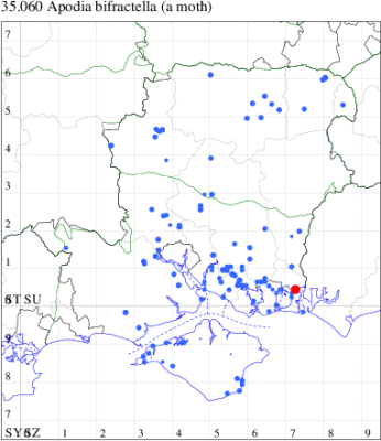 Nationally scarce, in hedgerows, open woodland and gardens, in Devon and Cornwall, and also Dorset, Somerset, Hampshire and Glamorgan; unknown in the British Isles until 1963 when one was taken at light at Ide, near Exeter, Devon (MBGBI Vol 4 part 2). In Hampshire, recorded for the first time at Winchester on 14 July 1987; subsequently the 21st century has produced a scattering of records across the county. The first record for the Isle of Wight was in 2019. Wingspan 10-14mm. Larva feeds within buds and young shoots of Bramble and Raspberry.