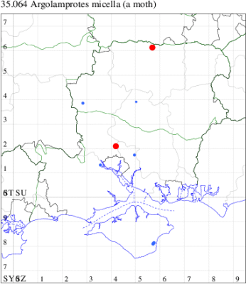Local on heathland throughout England and Wales. In Hampshire fairly common on the heaths of the New Forest and the north-east, but very local elsewhere. Not recorded from the Isle of Wight since 1975. Wingspan 12-13 mm. Flies in afternoon, and occasionally comes to light. One of the more distinctive gelechiids, unlikely to be confused with any other species. Larva feeds on Heather, living between shoots spun together with silk, and over-wintering as an egg.