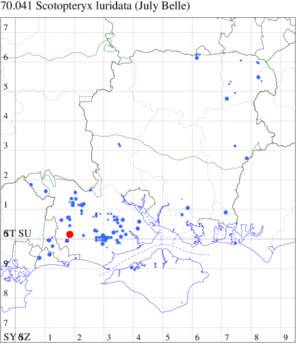 Common on heathland, moorland, downland, scrubland, open woodland and shingle beaches throughout much of the British Isles. In Hampshire, generally annually reported from the heaths of the New Forest but very irregular in the north-east of the county, and rare or absent elsewhere (the last Isle of Wight record was in 2004 (as of 2017). Wingspan 32-38 mm. Very similar to Lead Belle S. mucronata, which see for differences. Larva feeds on Dyer's Greenweed, Gorse and Petty Whin.