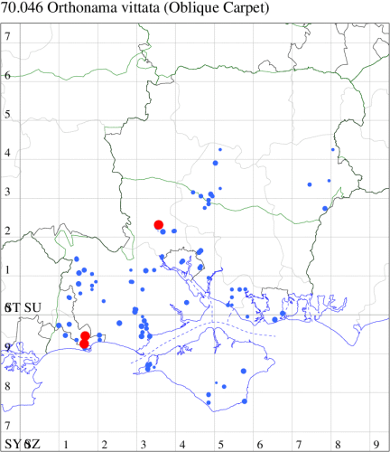 Nationally scarce (Nb) on sandy heathland in Breckland, chalk downland in southern England, and sand-dunes at various points along the coasts of England and Wales. In Hampshire and on the Isle of Wight still occurs on the dunes at Hayling Island, with occasional records from the chalk, particularly on Broughton Down. Wingspan 22-25 mm. Most likely to be confused with Oblique Carpet Orthonama vittata, but that species has streak from apex of forewing to about half-way along termen. Larva feeds on Lady's Bedstraw, over-wintering as a pupa.