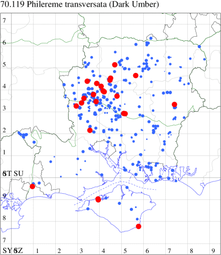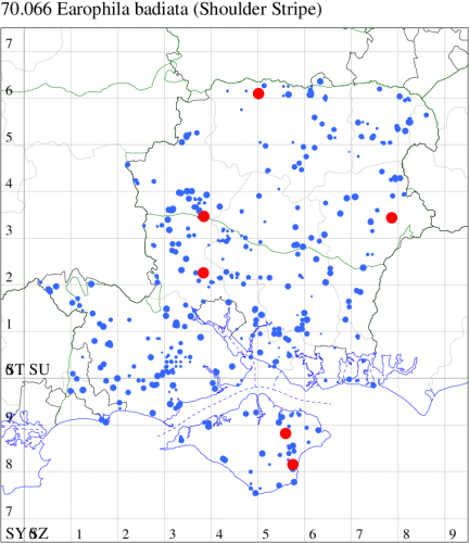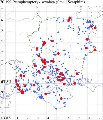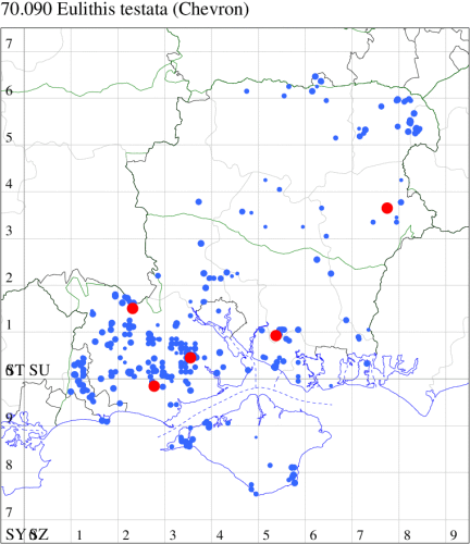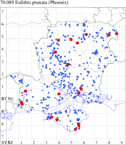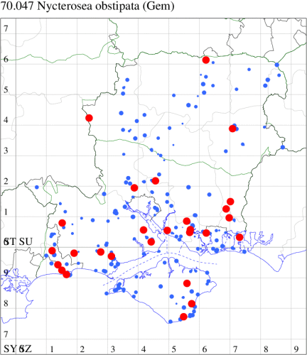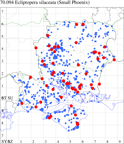 VC11: Marchwood, one, 11 Aug (CTha); Woodlands, NF, one, 01 Aug (RBW); Cromarty Pond area, Lord's Hill, one, 12 Jul; one, 18 Jul (JClx); North Baddesley, one, 17 Jul; two, 19 Jul (RWPas); East Tytherley, one, 27 Jul (GCE); Mottisfont Abbey NT, nr Romsey, one, 01 Jul; one, 17 Jul; one, 23 Jul (TSto); Romsey, one, 23 Jul; present, 24 Jul; one, 30 Jul; one, 31 Jul (SRC); Fishlake Meadows, one, 12 Aug (NRJ); Romsey, one, 18 Jul; one, 23 Jul; two, 11 Aug (MJB); one, 22 Jul; two, 30 Jul (NRJ); Ashley, one, 13 Jul (GCE); Swaythling, Southampton, present, 30 Jul (MEdg); Southampton, one, 26 Jul (MGP); Itchen Valley CP, four, 19 Jul (CTha); Itchen Valley C.P., three, 19 Jul (F.M.G.); Allbrook, one, 07 Jun; three, 11 Jul; one, 28 Jul; one, 05 Aug; one, 10 Aug; one, 11 Aug; Highbridge, Eastleigh, one, 02 Aug (SIng); Brownwich Cliffs, Titchfield, one, 26 Jul (F.M.G.); Stubbington, one, 30 Jul (DPH); Funtley, one, 11 Jul (TDC); Fareham, one, 16 Jul (ADT); Dean, Bishop's Waltham, present, 30 Jul (CMor); Wickham, two, 29 Jul; two, 30 Jul; three, 02 Aug (JRDS); Portsmouth, one, 11 Jul (IRT); Waterlooville, one, 15 Aug (DWhe); Old Winchester Hill, one, 30 Aug (F.M.G.); Horndean, one, 12 Jul (PHog); Stroud, Petersfield, two, 19 May; two, 27 Jul (RAll); Muscliffe, one, 19 Jul (CMur det. CMur,MLan); Merritown Heath, one, 29 Jun (DFoo); Hurn, one, 12 Aug (MJef); Christchurch: Cross Way, one, 12 Jul (LPyk); Burton, nr Christchurch, one, 16 Jul; one, 30 Jul (JStw);