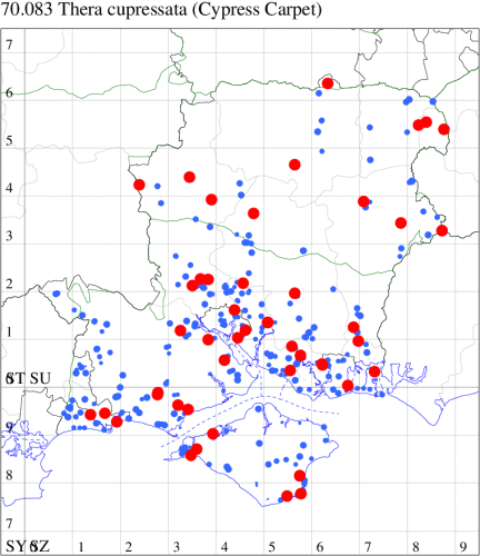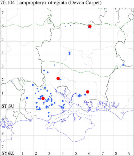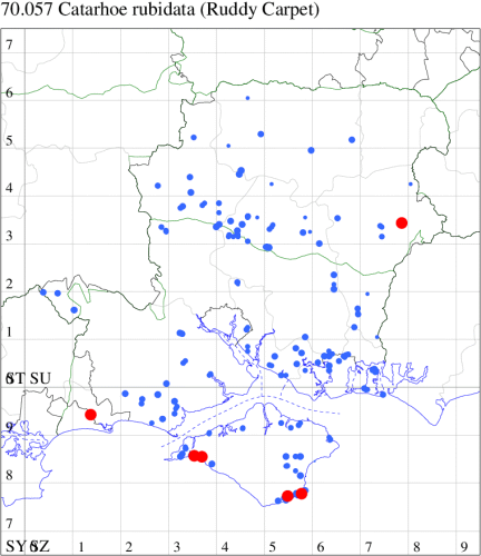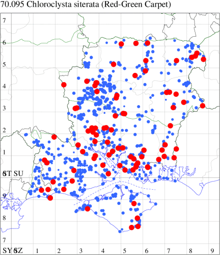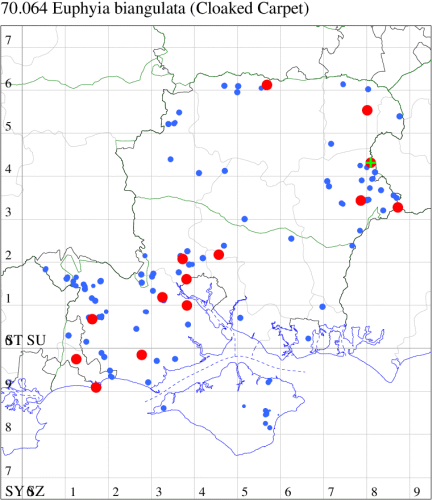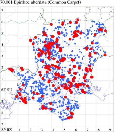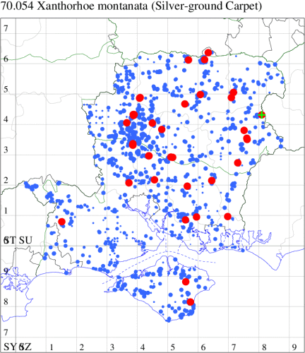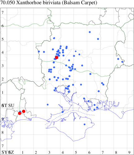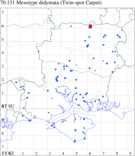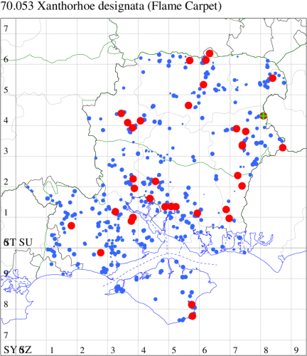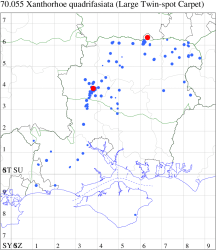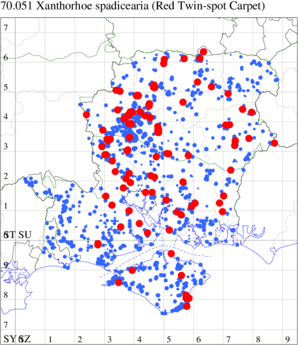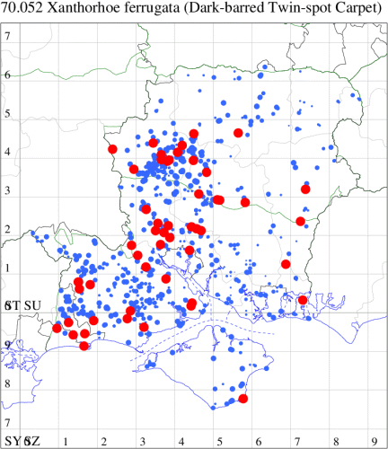 Common in gardens, woodland, hedgerows, downs, fens, moors and sand-dunes throughout the British Isles, a species of conservation concern under the UK Biodiversity Action Plan. Widespread and common in Hampshire, but rather scarce on the Isle of Wight, with just four records there so far this century. Wingspan 24-27 mm. Very similar in form to Red Twin-spot Carpet X. spadicearia, which see; the red form, which has yet to be reliably identified from Hampshire, should be treated as indistinguishable without dissection of the genitalia. Larva feeds on Bedstraw, Ground-ivy and Dock, over-wintering as a pupa.