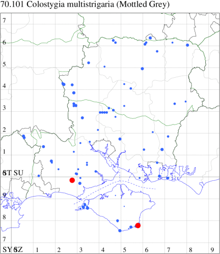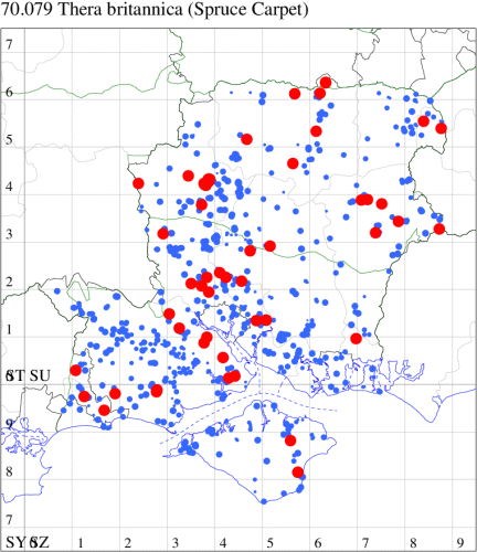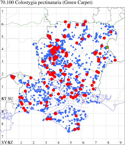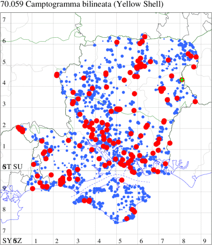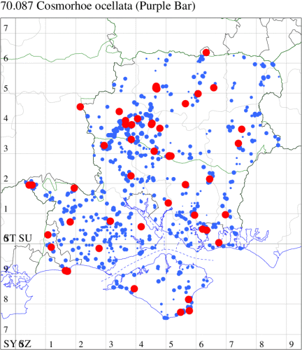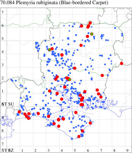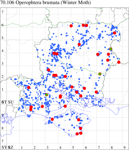 For the maps, all records prior to 2024 are shown by a blue dot (the larger the dot, the more recent), with the current year's records shown in red. As previous records are superimposed on any report for 2024, new sites have greater emphasis (i.e. will show as 'more red').