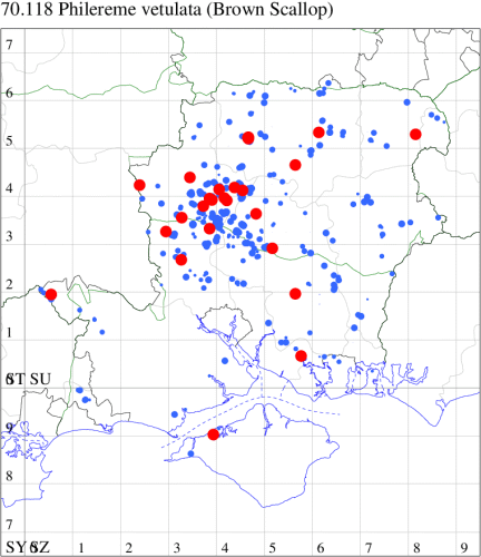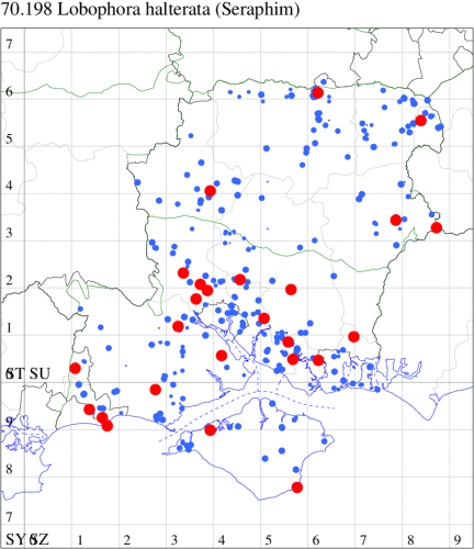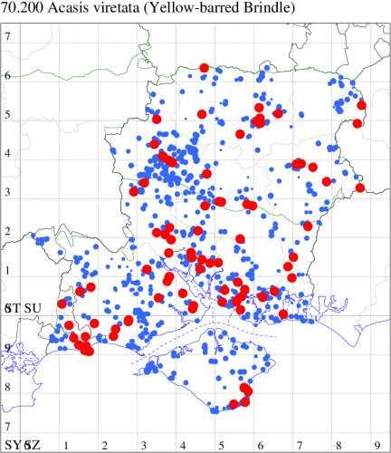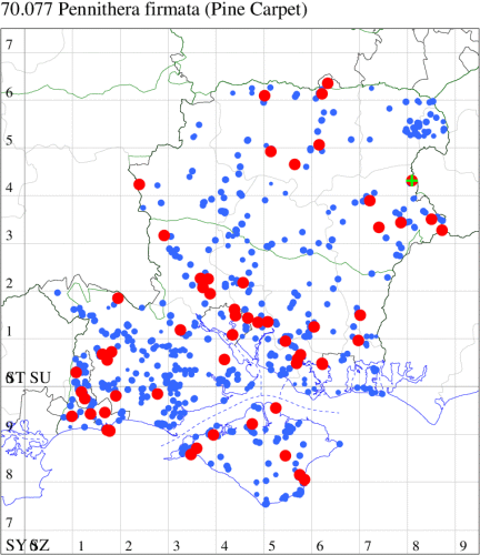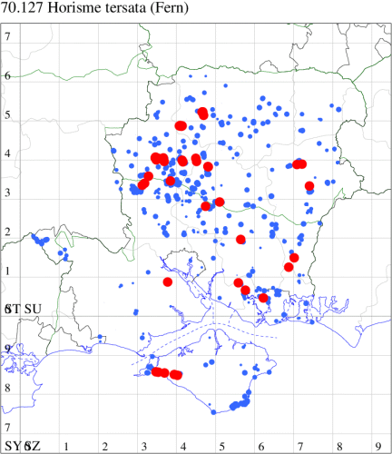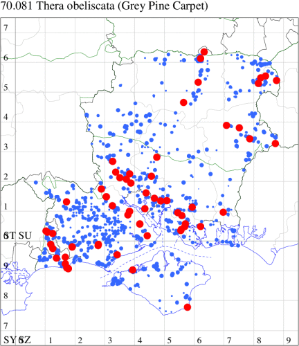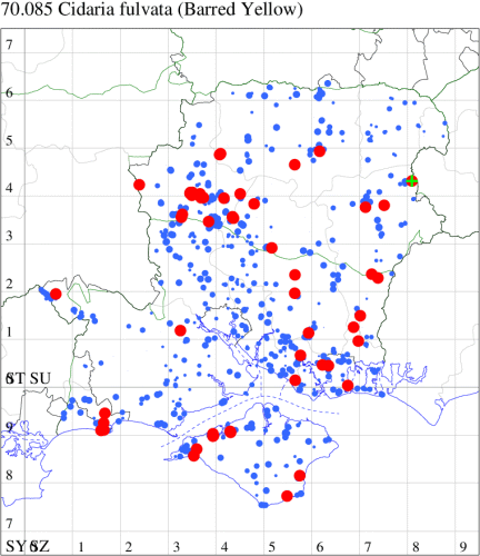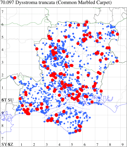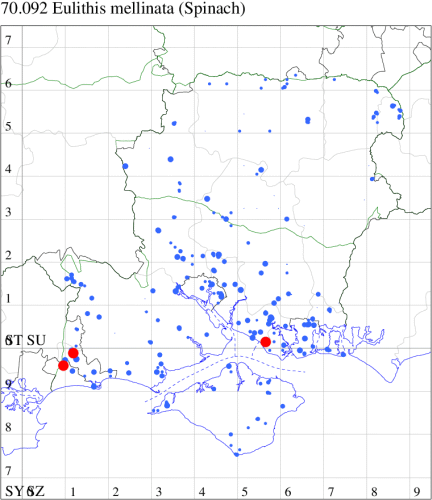 VC11: Linford Bottom, two, 05 Aug (CLew); Marchwood, one, 19 May (TDCh); one, 02 Aug; one, 07 Aug; one, 11 Aug (CTha); Woodlands, NF, one, 14 May (RBW); North Baddesley, one, 16 Aug (RWPas); Romsey, one, 18 May; one, 08 Aug; one, 17 Aug (NRJ); Swaythling, Southampton, one, 14 May (MEdg); Allbrook, one, 30 May; one, 02 Sep (SIng); Botley, one, 09 May; one, 18 Aug (SLB); Curdridge, one, 12 Aug (CGree det. LLay); Wickham, three, 02 Aug (JRDS); Waterlooville, one, 07 May; one, 09 May; one, 07 Aug; one, 17 Aug (DWhe); Lovedean, one, 19 Jul (ARJa); Stroud, Petersfield, one, 06 May; two, 12 May; one, 19 May; present, 21 May; one, 20 Jun; one, 26 Jun (RAll); Buriton, three, 01 Aug (FVes); Sway, one, 12 May; one, 27 May; one, 30 May; one, 20 Jun; one, 12 Aug; three, 13 Aug (SKee);