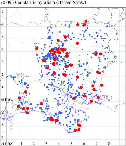 VC11: Brockwood, one, 30 May (SDut); Blashford Lakes HIWWT NR, two, 16 Jul; one, 21 Sep (PWhtk); one, field obs., 14 May (GLes); two, 16 Jul (PWhtk); Romsey, two, 11 Aug (NRJ); Bevois Valley, Southampton, one, 10 Aug (MCrei); Allbrook, one, 15 May; one, 21 Jul; one, 17 Aug (SIng); Brownwich Cliffs, Titchfield, one, 16 Aug (F.M.G.); South Holt Farm, NF, one, 28 Aug (CGree det. OHen); Merritown Heath, present, 17 Aug (DFoo); Browndown, three, 09 Aug (F.M.G.);