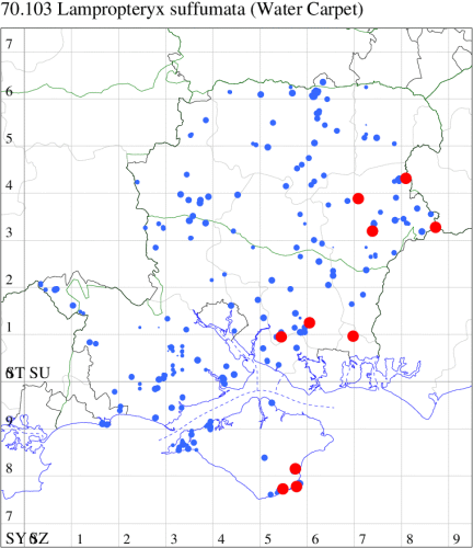 Uncommon, in damp grassland, water meadows, marshes, river-banks and damp areas in parts of southern England and south-eastern England. In Hampshire first reported at Wherwell in 1964, and now established in the upper valley of the River Test in damp woodland containing the larval foodplant, and also beginning to appear in the Itchen Valley. The only report from the Isle of Wight was back in 1999. Wingspan 27-30 mm. Occurs in two forms, a pale spring generation and a darker summer generation, the former most recalls Sharp-angled Carpet Euphyia unangulata and Wood Carpet Epirrhoe rivata. Larva feeds on Orange Balsam, over-wintering as a pupa.
