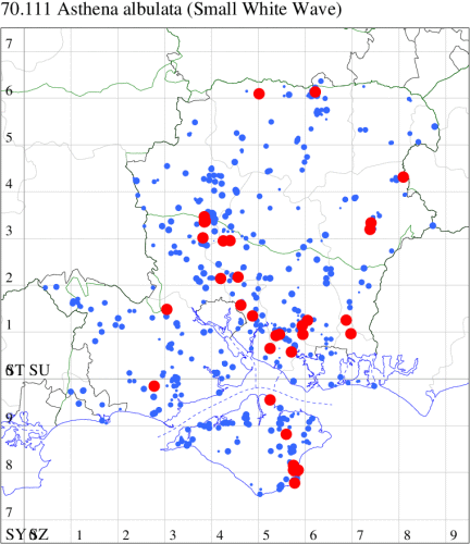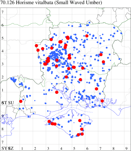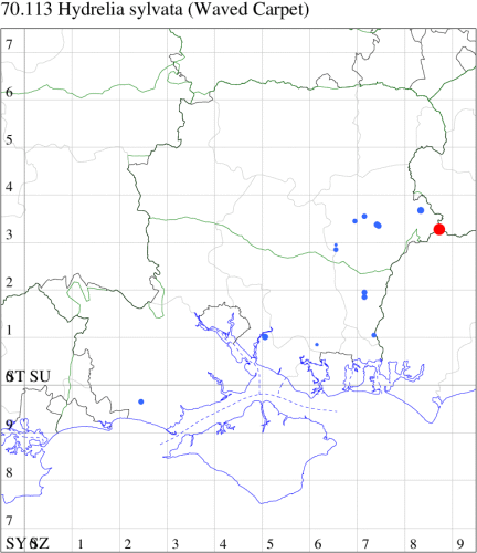 Local in fens, water meadows, damp woodland, marshes and river-banks throughout much of the British Isles, a species of conservation concern under the UK Biodiversity Action Plan. In Hampshire and on the Isle of Wight an uncommon marsh-inhabiting species, records of which are scattered thinly across the three vice-counties. Wingspan 24-27 mm. The most likely confusion species is Oblique Striped Phibalapteryx virgata, which see for differences. Larva feeds on Marsh Bedstraw and Heath Bedstraw.
